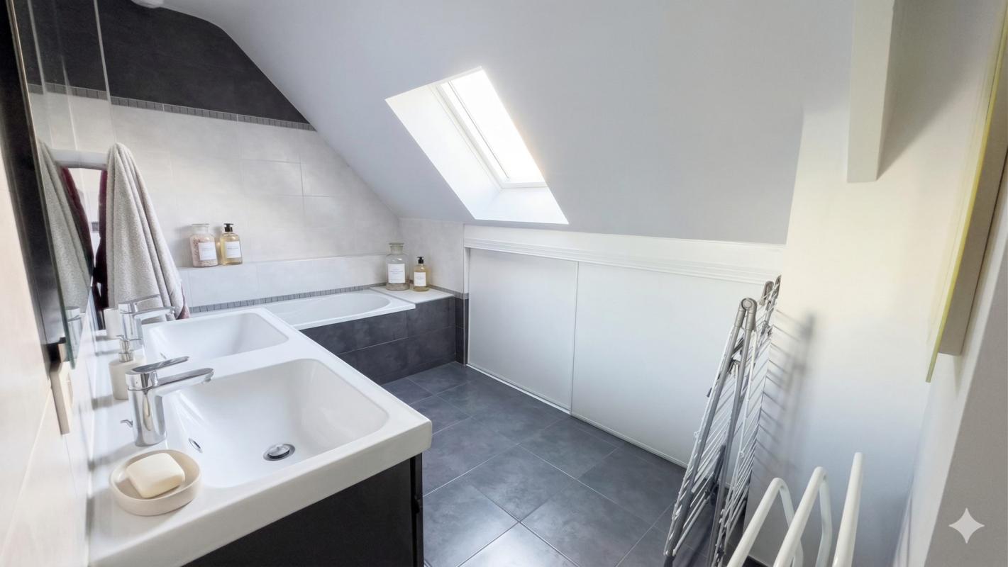 Le sous-sol complet constitue un véritable atout : une pièce aménagée, isolée et chauffée avec grands dressings permet d’envisager une chambre supplémentaire, un bureau ou un espace dédié à vos projets, en complément d’une cave et d’un WC.