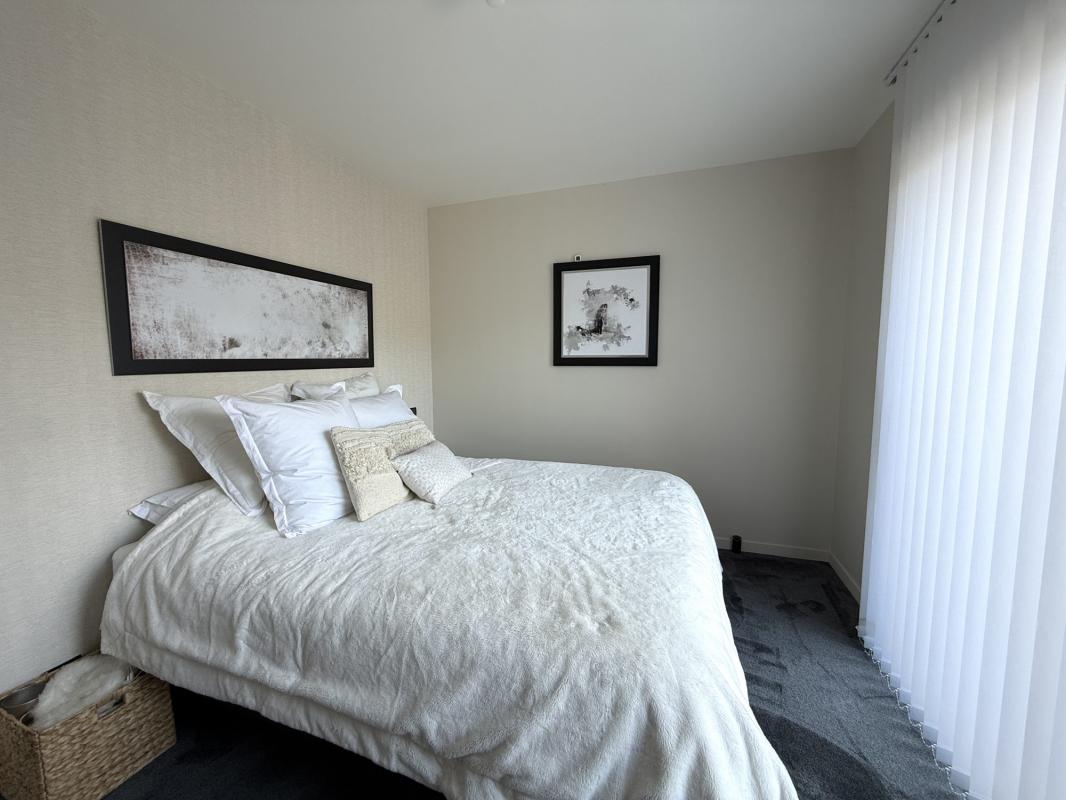 Le salon, décoré par une décoratrice d’intérieur, se distingue par ses aménagements et meubles sur mesure, apportant une touche élégante et chaleureuse à l’ensemble.