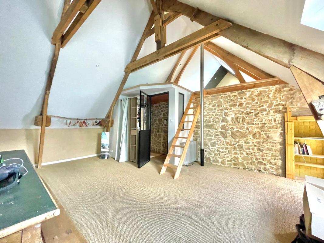 A l’étage, nous allons pouvoir découvrir un dégagement, deux chambres de 20 m² dont une qui possède une mezzanine pour une chambre atypique supplémentaire. A noter que des arrivées d’eau sont prévues dans cette chambre. Vous y retrouverez également le charme de la pierre.