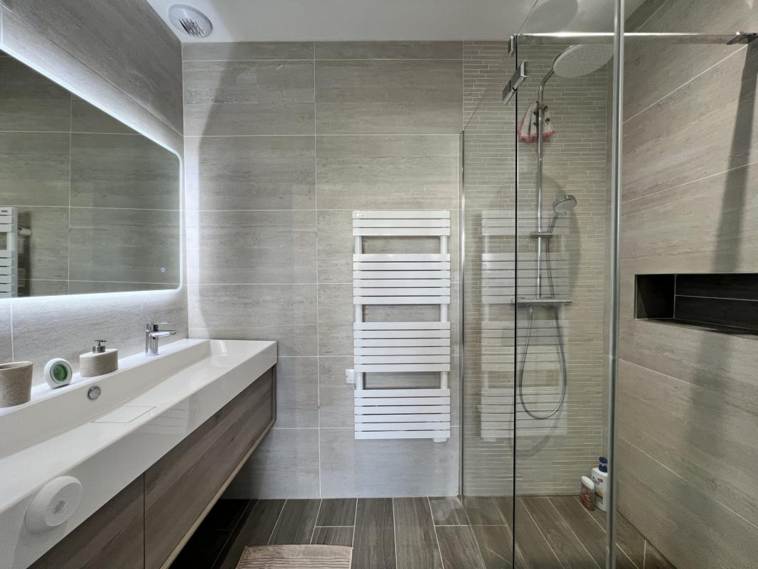 Cet espace rez-de-chaussée se complète avec une chambre avec coin dressing et salle d’eau privative, un WC indépendant et un cellier.