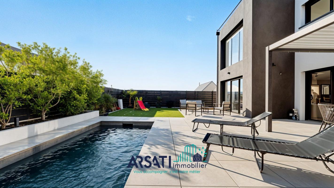 Les extérieurs ont été soigneusement aménagés : une belle terrasse exposée Sud-Est (dalle sur plots) avec pergola bioclimatique, une piscine, un jardin agréable, le tout sur un terrain d’environ 355 m².