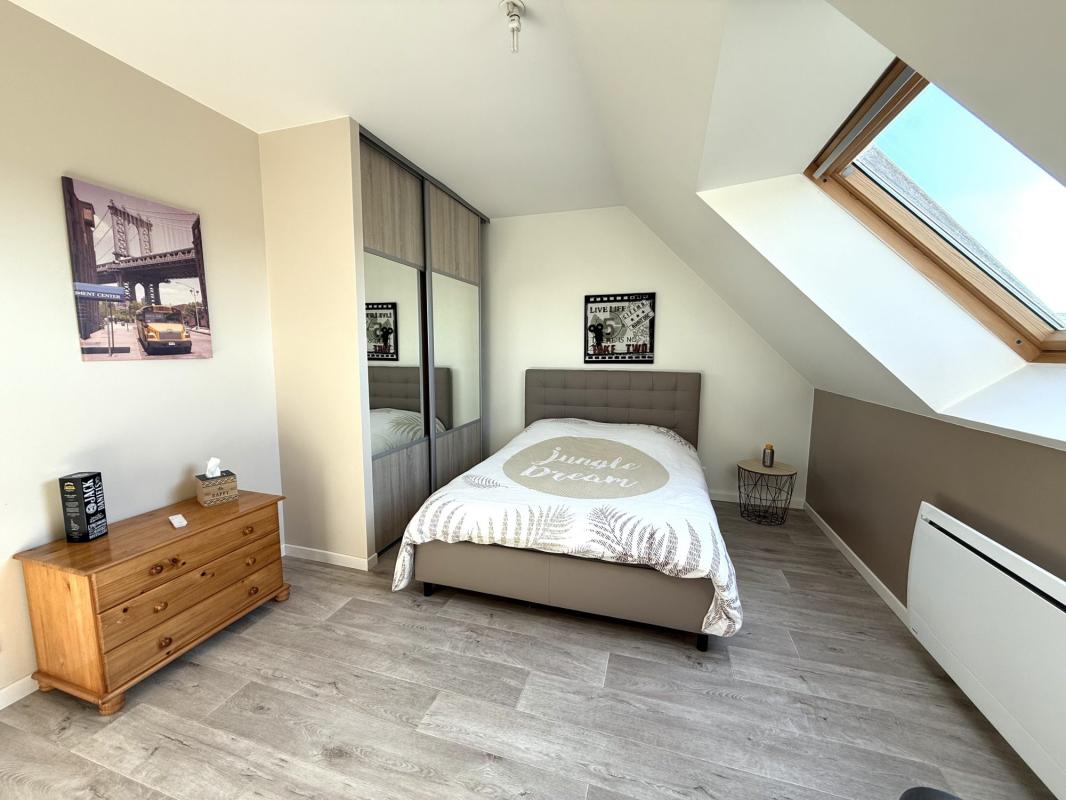 À l’étage, vous trouverez une spacieuse salle de bains, trois chambres dont deux équipées de placards, ainsi qu’un second WC indépendant.