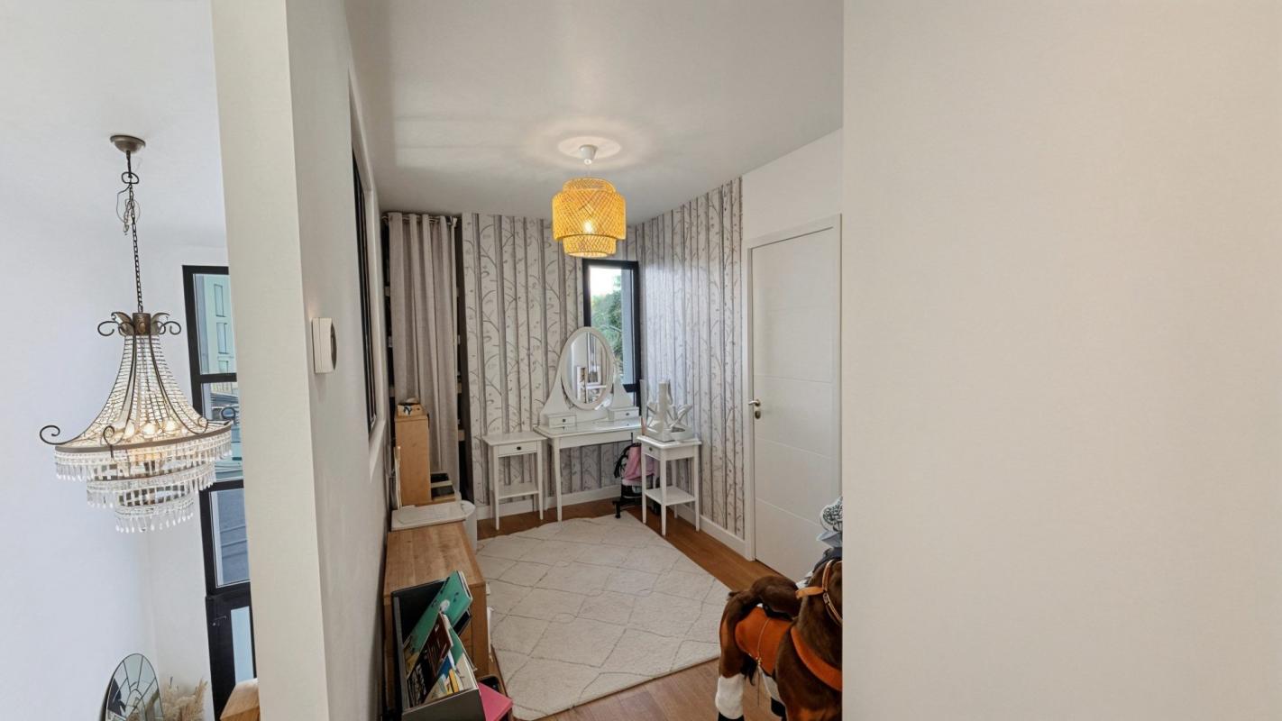 À l’étage, une grande mezzanine desservant trois chambres, une salle de bains avec douche et baignoire, ainsi qu’un WC indépendant.