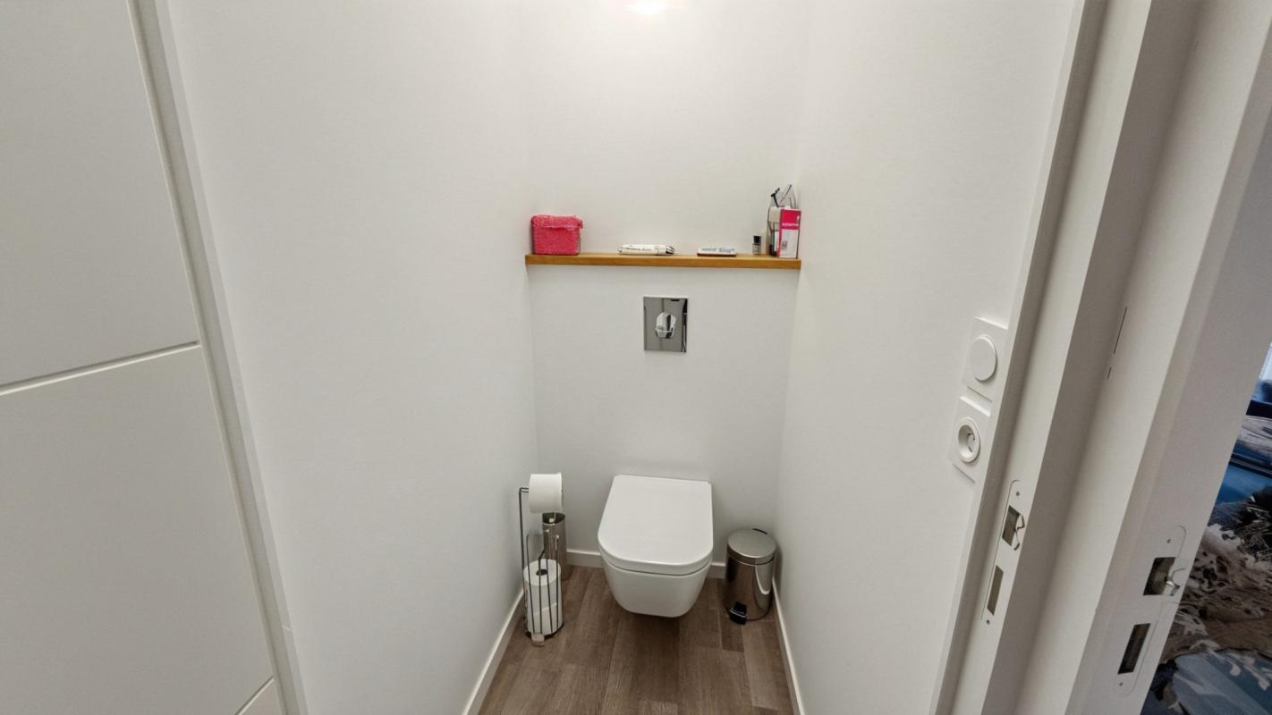 Un dégagement avec une chambre avec un placard, salle de bain et un WC indépendant.